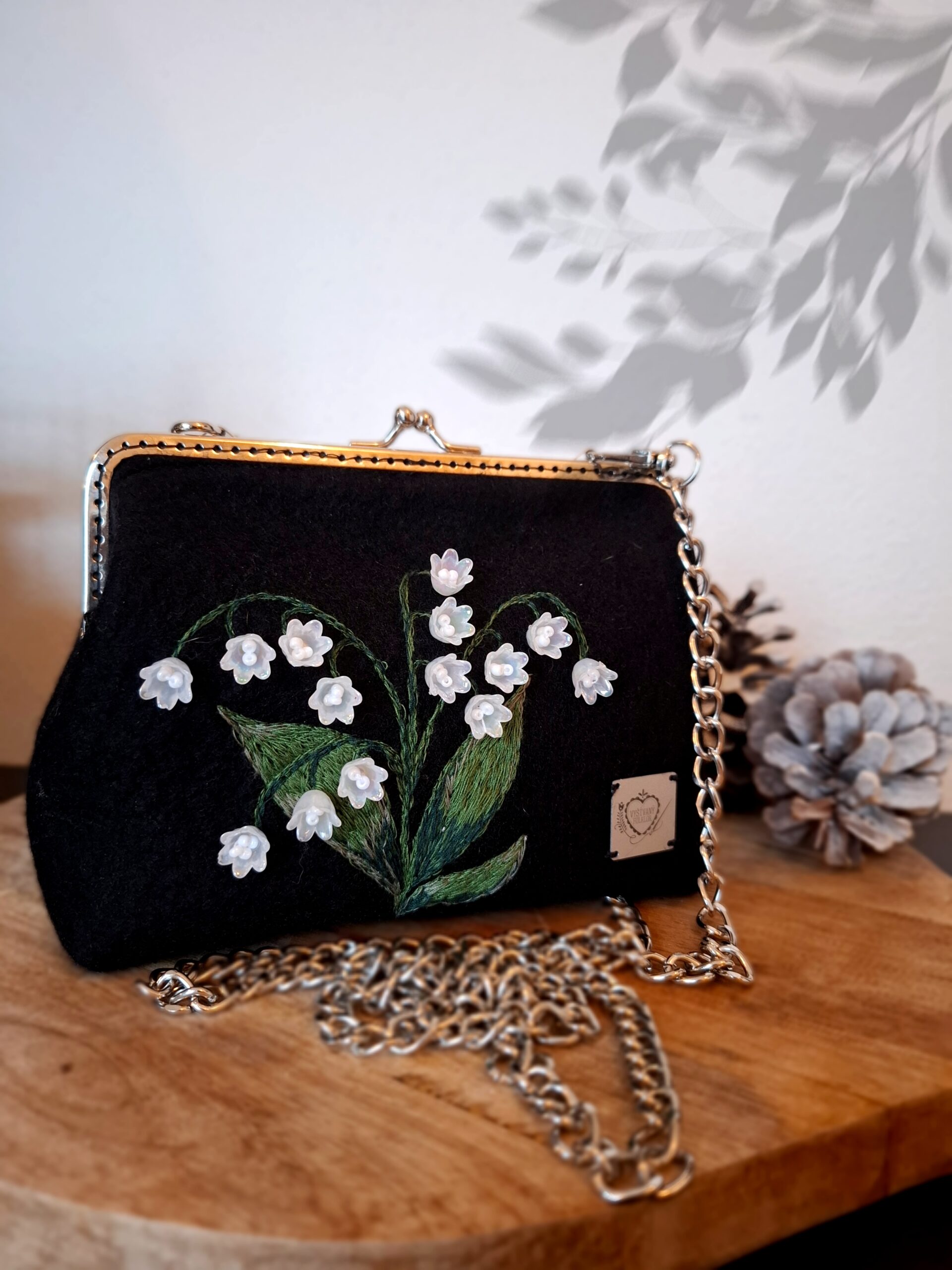 Kabelka ze 100% merino vlny s jemnou výšivkou konvalinek. Elegantní a zároveň originální doplněk pro každodenní nošení i slavnostní příležitosti.